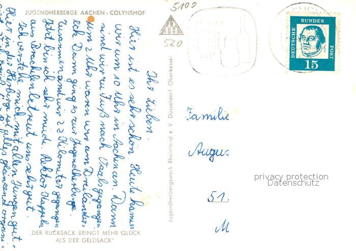 72952886 alte Postkarte Aachen Jugendherberge Colynshof postalisch gelaufen Erhaltung siehe scans [FriedD77] KatCode: 11110005313000