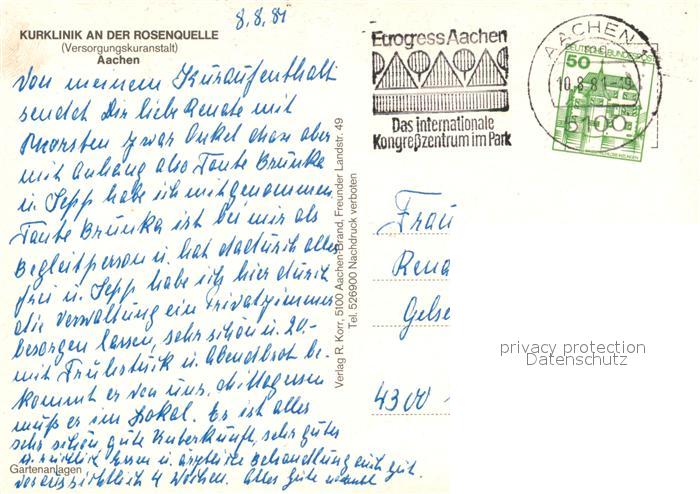 73067129 alte Postkarte Aachen Kurklinik Rosenquelle postalisch gelaufen Erhaltung siehe scans [NatalD47] KatCode: 11110005313000
