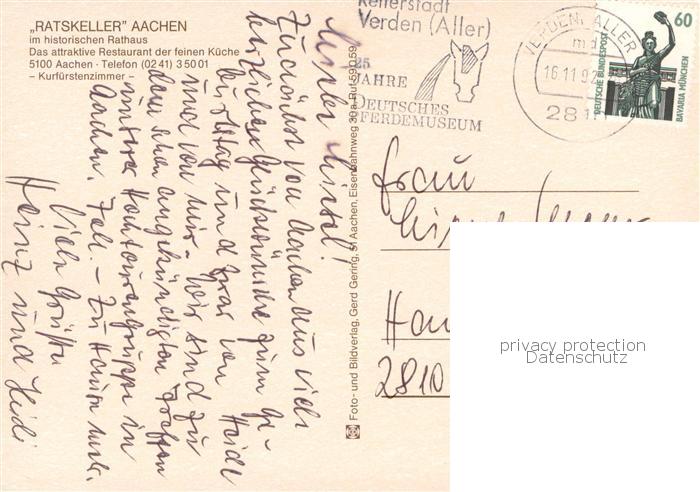 73762198 alte Postkarte Aachen Ratskeller Restaurant im historischen Rathaus Kurfuerstenzimmer postalisch gelaufen Erhaltung siehe scans [FriedD77] KatCode: 11110005313000