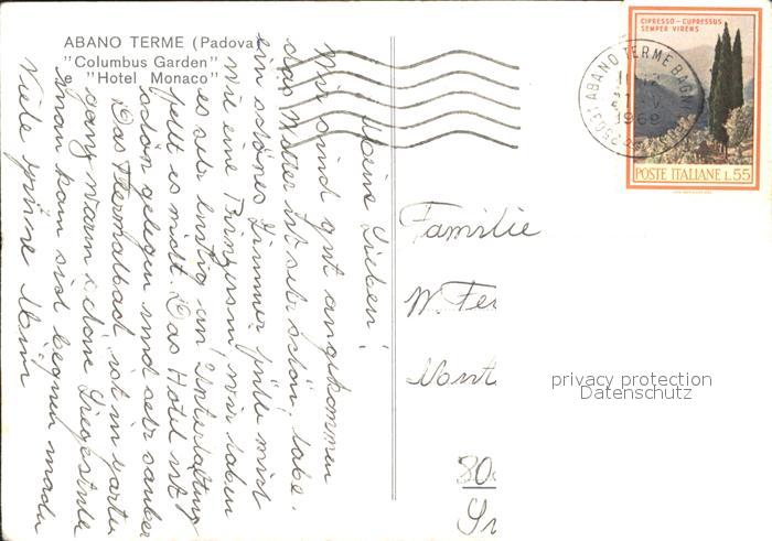 old postcard Abano Terme Columbus Garden Hotel Monaco postalisch gelaufen Erhaltung siehe scans