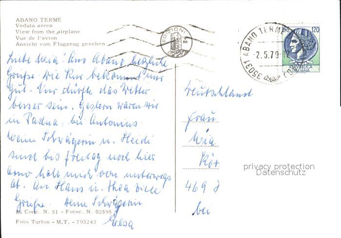 old postcard Abano Terme Fliegeraufnahme postalisch gelaufen Erhaltung siehe scans
