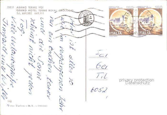 old postcard Abano Terme Grand Hotel Terme Royal Orologio postalisch gelaufen Erhaltung siehe scans