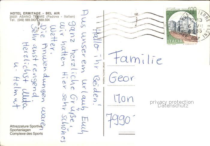 old postcard Abano Terme Hotel Ermitage Bel Air Schwimmbad Hallenbad Tennis Aussenansicht postalisch gelaufen Erhaltung siehe scans [AndreD76 kt121box]