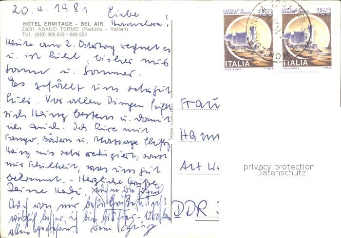 old postcard Abano Terme Hotel Ermitage Bel Air Speisesaal Terrasse Swimmingpool postalisch gelaufen Erhaltung siehe scans