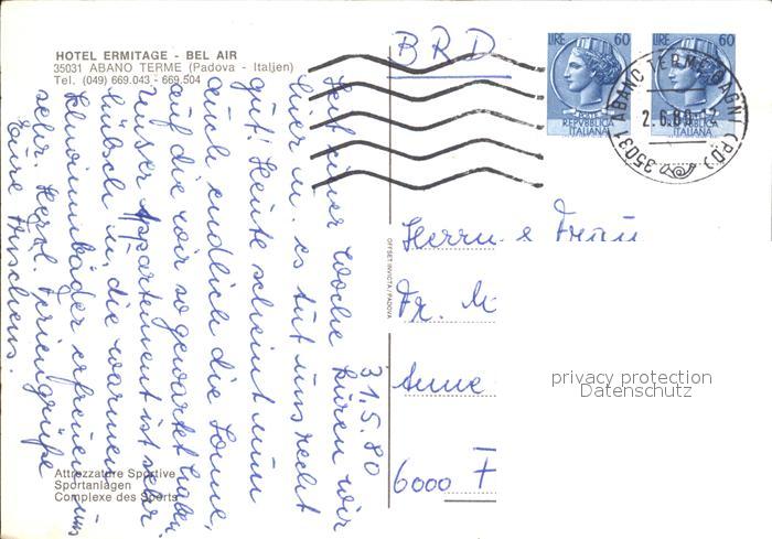 old postcard Abano Terme Hotel Ermitage Tennisplatz Hallenbad Miniglfanlage Freibad postalisch gelaufen Erhaltung siehe scans