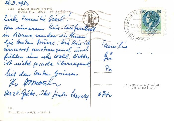 old postcard Abano Terme Hotel Ritz postalisch gelaufen Erhaltung siehe scans [AndreD76]