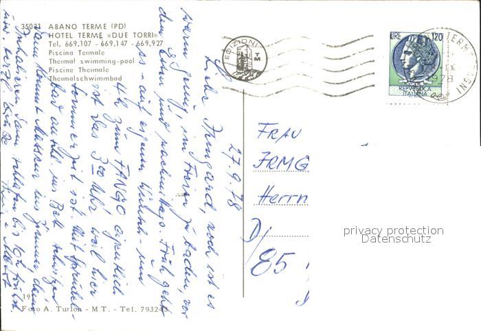 old postcard Abano Terme Hotel Terme Due Torri postalisch gelaufen Erhaltung siehe scans