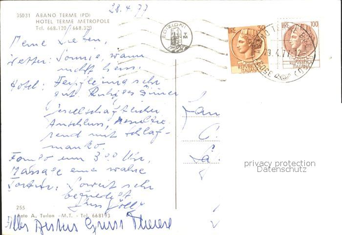 old postcard Abano Terme Hotel Terme Metropole postalisch gelaufen Erhaltung siehe scans