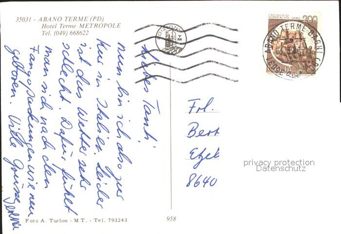 old postcard Abano Terme Hotel Terme Metropole postalisch gelaufen Erhaltung siehe scans