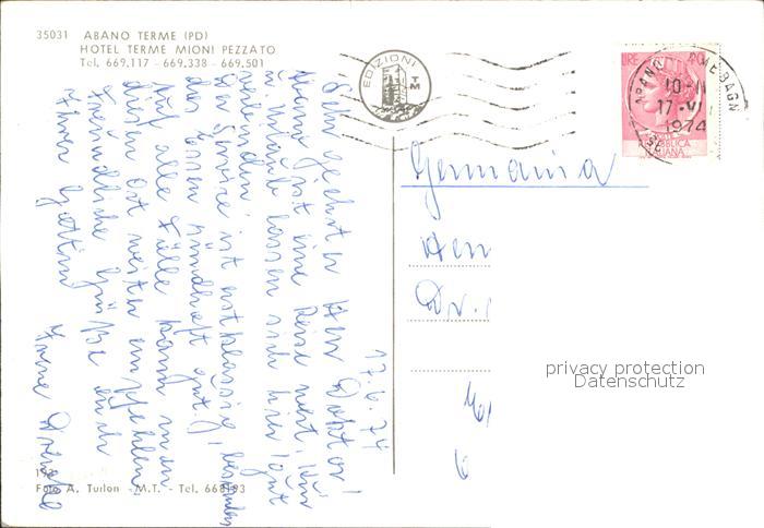 old postcard Abano Terme Hotel Terme Mioni Pezzato postalisch gelaufen Erhaltung siehe scans