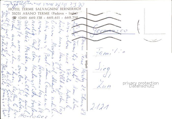 old postcard Abano Terme Hotel Terme Salvagnini Bernerhof postalisch gelaufen Erhaltung siehe scans