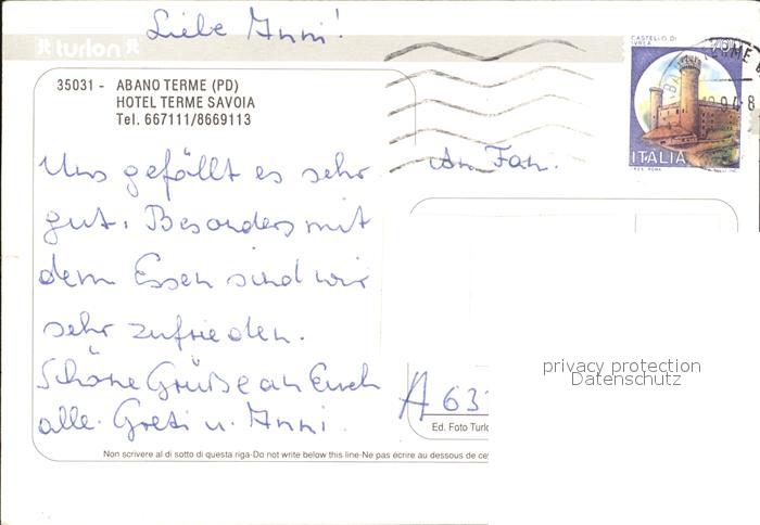 old postcard Abano Terme Hotel Terme Savoia postalisch gelaufen Erhaltung siehe scans