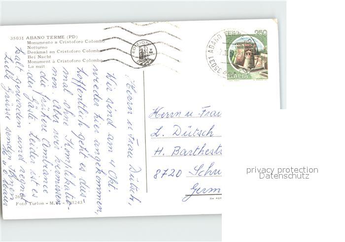 old postcard Abano Terme Monumento a Cristoforo Colombo Notturno postalisch gelaufen Erhaltung siehe scans