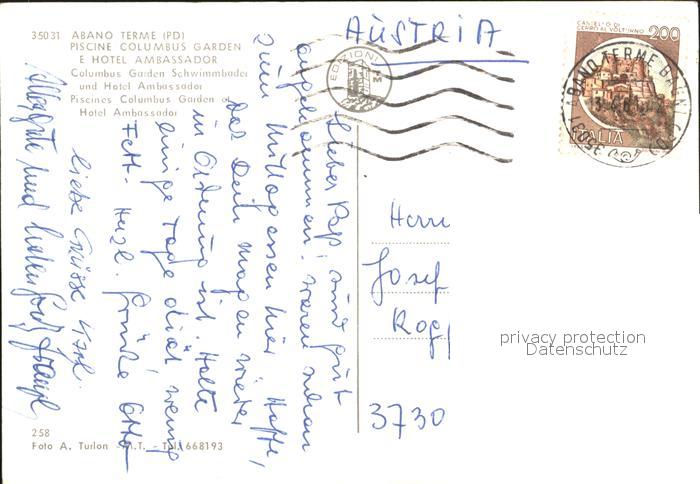 old postcard Abano Terme Piscine Columbus Garden Hotel Ambassador postalisch gelaufen Erhaltung siehe scans