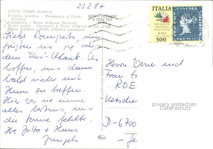 old postcard Abano Terme Stadtgarten Pietro d Abano Denkmal postalisch gelaufen Erhaltung siehe scans