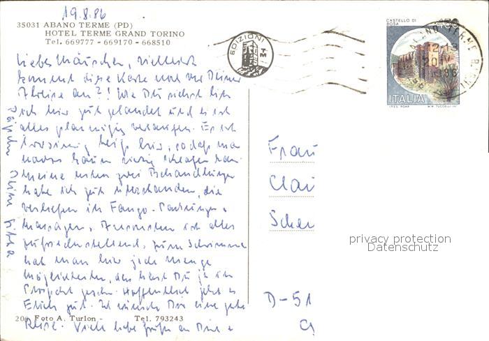 old postcard Abano Terme Terme Hotel Grand Torino postalisch gelaufen Erhaltung siehe scans