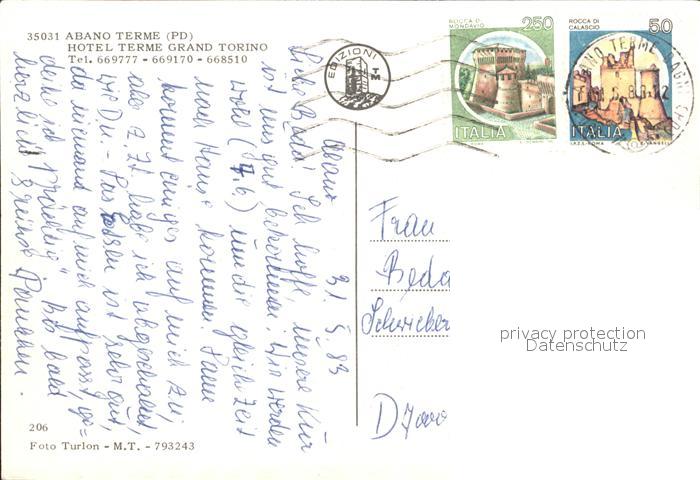 old postcard Abano Terme Terme Hotel Grand Torino postalisch gelaufen Erhaltung siehe scans