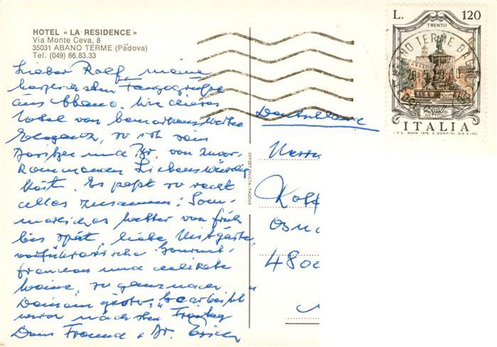 73905558 old postcard Abano Terme Veneto IT Hotel La Residence Gastraum postalisch gelaufen Erhaltung siehe scans [WerneD78] KatCode: 11240
