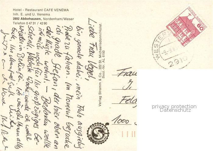 73642606 alte Postkarte Abbehausen Hotel Restaurant Cafe Venema Muehle Kirche postalisch gelaufen Erhaltung siehe scans [WerneD78] KatCode: 11110003461007