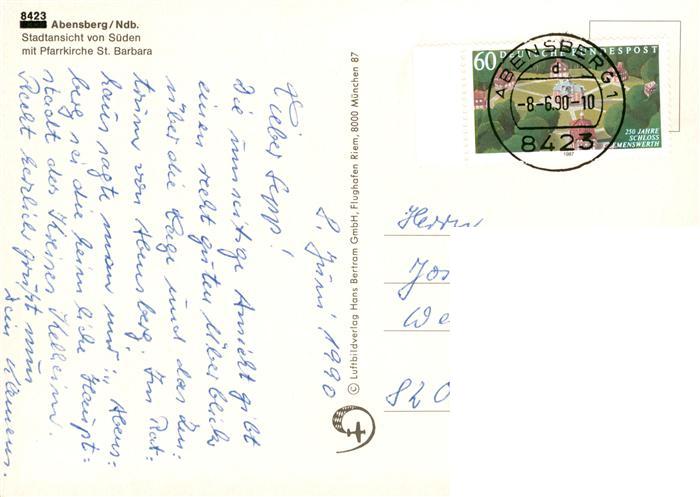 73945311 alte Postkarte Abensberg Fliegeraufnahme mit Pfarrkirche St Barbara postalisch gelaufen Erhaltung siehe scans [WerneD78] KatCode: 11110009273111