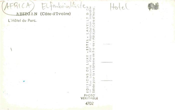 73972597 Abidjan Cote d Ivoire Elfenbeinkueste Hôtel du Parc postalisch nicht gelaufen Erhaltung siehe scans [FriedD77] KatCode: 18110