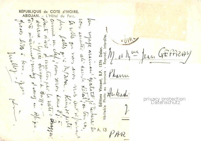 old postcard Abidjan Hotel du Parc postalisch gelaufen Erhaltung siehe scans [WerneD78]