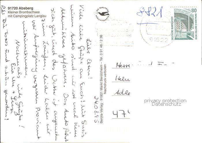 71947684 alte Postkarte Absberg Kleiner Brombachsee Campingplatz Langlau Fliegeraufnahme postalisch gelaufen Erhaltung siehe scans KatCode: 11110009577111
