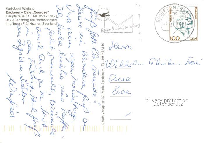 73660581 alte Postkarte Absberg TerrassenCafe Seerose am Brombachsee Neues Fraenkisches Seenland postalisch gelaufen Erhaltung siehe scans [FriedD77] KatCode: 11110009577111