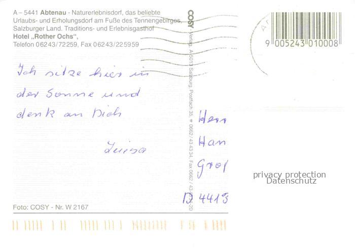 74019342 alte Postkarte Abtenau AT Erholungsort am Fusse des Tennengebirges Hotel Rother Ochs Kirche postalisch gelaufen Erhaltung siehe scans [FriedD77] KatCode: 11390323050201