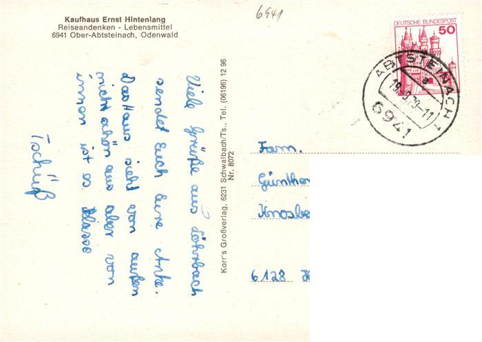 73890090 alte Postkarte Abtsteinach Hessen Dorfbrunnen Panorama Schwarze Brunnen Neubaugebiet Kriegerdenkmal postalisch gelaufen Erhaltung siehe scans [WerneD78] KatCode: 11110006431001