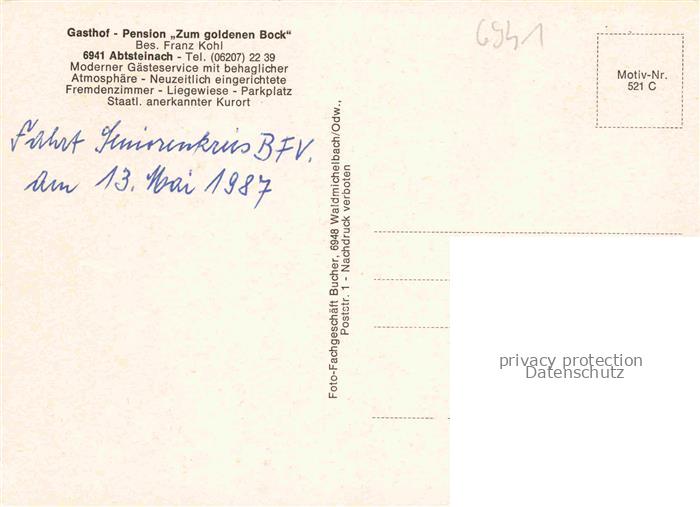 74048166 Abtsteinach Hessen Gasthof Pension Zum goldenen Bock Gastraeume Ausritt postalisch nicht gelaufen Erhaltung siehe scans [FriedD77] KatCode: 11110006431001