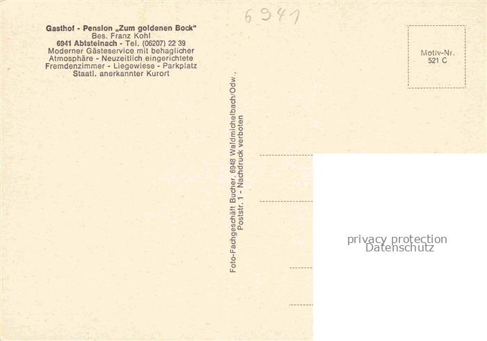 74048085 Abtsteinach Hessen Gasthof Pension Zum goldenen Bock Gastraum Ausritte postalisch nicht gelaufen Erhaltung siehe scans [FriedD77] KatCode: 11110006431001