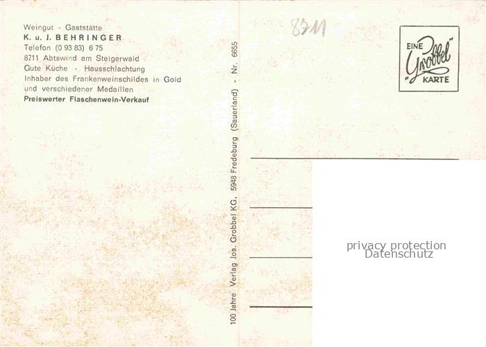 74054379 Abtswind Weingut Gaststaette Behringer postalisch nicht gelaufen Erhaltung siehe scans [WerneD78] KatCode: 11110009675111
