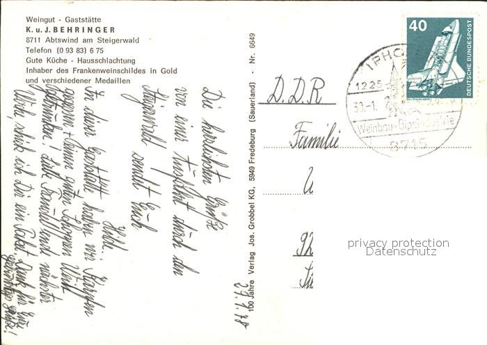 72434665 alte Postkarte Abtswind Weingut Gaststaette Behringer postalisch gelaufen Erhaltung siehe scans KatCode: 11110009675111