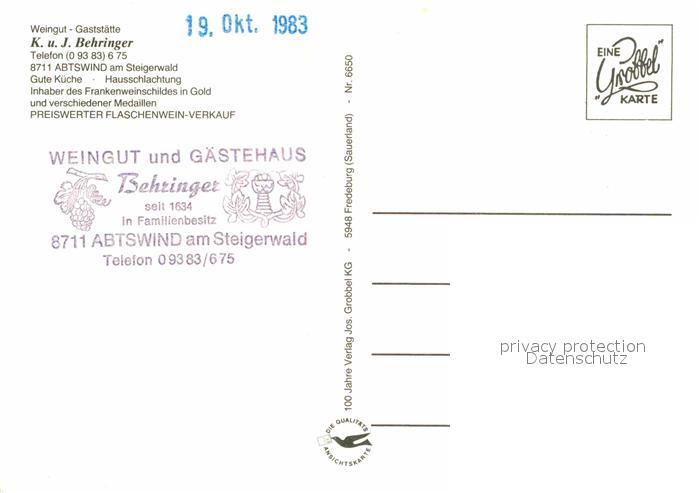 72716653 Abtswind Weingut Restaurant K. und J. Behringer postalisch nicht gelaufen Erhaltung siehe scans [LiesaD40] KatCode: 11110009675111