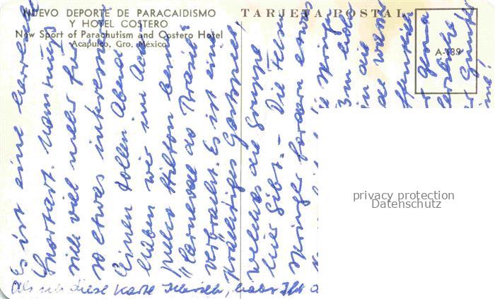 74042816 Acapulco Mexico New Sport of Parachutism and Costero Hotel postalisch nicht gelaufen Erhaltung siehe scans [WerneD78] KatCode: 14120