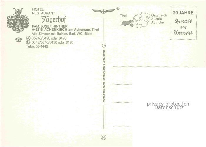 74152802 Achenkirch Achensee Tirol AT Hotel Jaegerhof Restaurant postalisch nicht gelaufen Erhaltung siehe scans [WerneD78] KatCode: 11390335070901