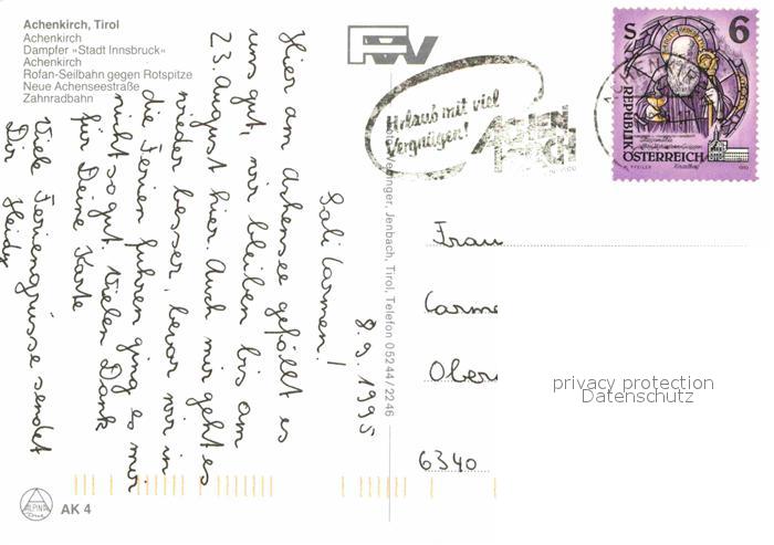 72721806 alte Postkarte Achenkirch Dampfer Stadt Innsbruck Rofan Seilbahn Rotspitze Zahnradbahn postalisch gelaufen Erhaltung siehe scans [KathaD79] KatCode: 11390335070901