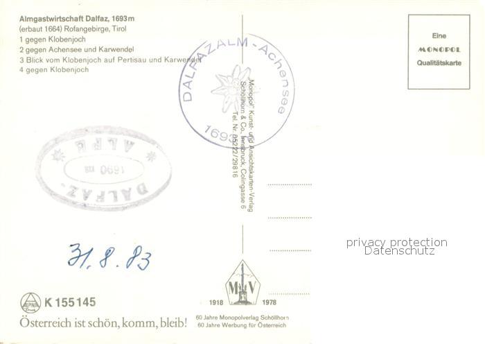 73644938 Achensee Almgastwirtschaft Dalfaz Landschaftspanorama Bergwelt Rofangebirge Bergsee Karendelgebirge postalisch nicht gelaufen Erhaltung siehe scans [FriedD77] KatCode: 11390335070907