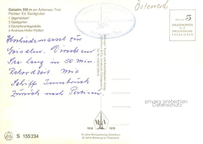 73027919 Achensee Gaisalm Jaegerstueberl Andreas-Hofer-Huetterl postalisch nicht gelaufen Erhaltung siehe scans [PaolaD17] KatCode: 11390335070907