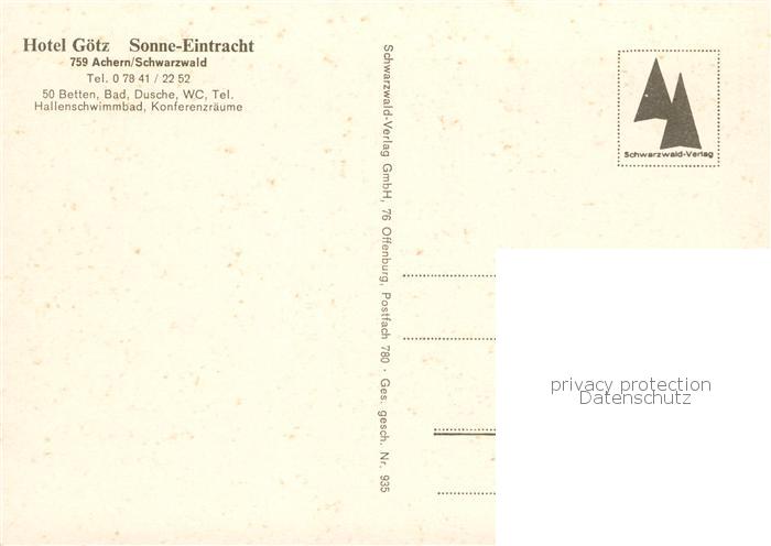 73845218 Achern Baden Hotel Goetz Sonne Eintracht postalisch nicht gelaufen Erhaltung siehe scans [WerneD78] KatCode: 11110008317001