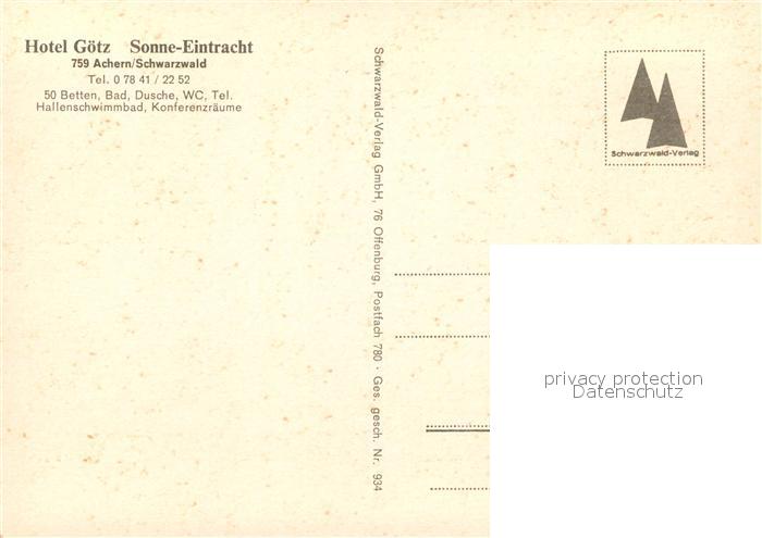 73204331 Achern Baden Hotel Goetz Sonne Eintracht Restaurant Schwarzwald postalisch nicht gelaufen Erhaltung siehe scans [FriedD77] KatCode: 11110008317001