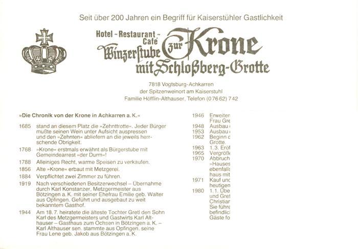 73929056 Achkarren Hotel Restaurant Cafe Winzerstube zur Krone Schlossberggrotte Fremdenzimmer postalisch nicht gelaufen Werbekarte (keine Postkarte) Erhaltung siehe scans [WerneD78] KatCode: 11110008315133