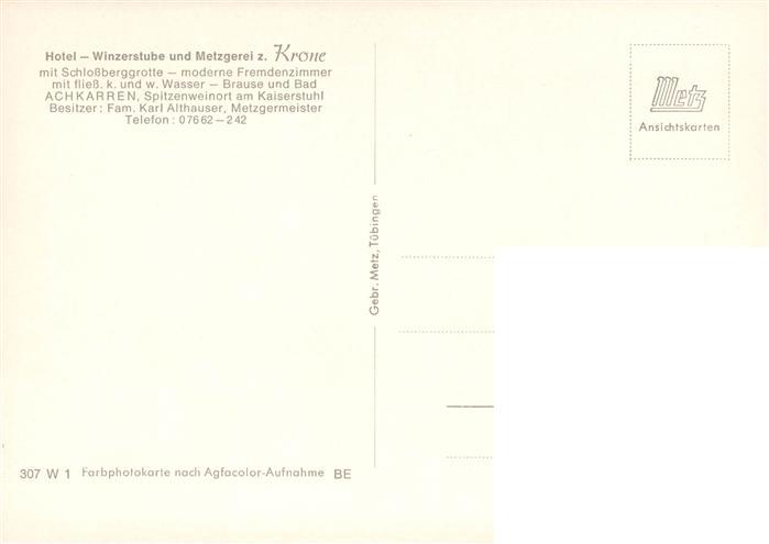 73901057 Achkarren Hotel zur Krone Schlossberg Grotte postalisch nicht gelaufen Erhaltung siehe scans [WerneD78] KatCode: 11110008315133