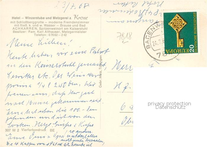 73778428 alte Postkarte Achkarren Kirche Hotel Winzerstube Zur Krone mit Schlossberg Grotte Gastraeume postalisch gelaufen Erhaltung siehe scans [WerneD78] KatCode: 11110008315133