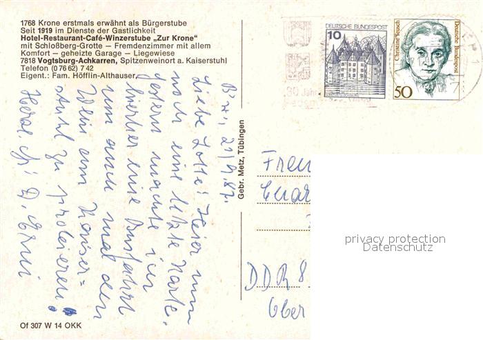 72631299 alte Postkarte Achkarren Winzerstube Zur Krone postalisch gelaufen Erhaltung siehe scans [LiesaD40] KatCode: 11110008315133