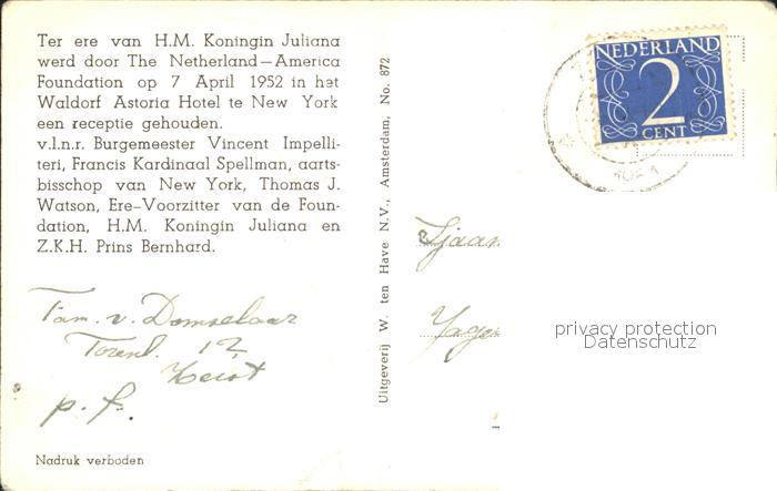 Adel Niederlande Koenigin Juliana Prinz Hendrik Netherland-America Foundation Waldorf Astoria Hotel New York Vincent Impelliteri postalisch nicht gelaufen Erhaltung siehe scans