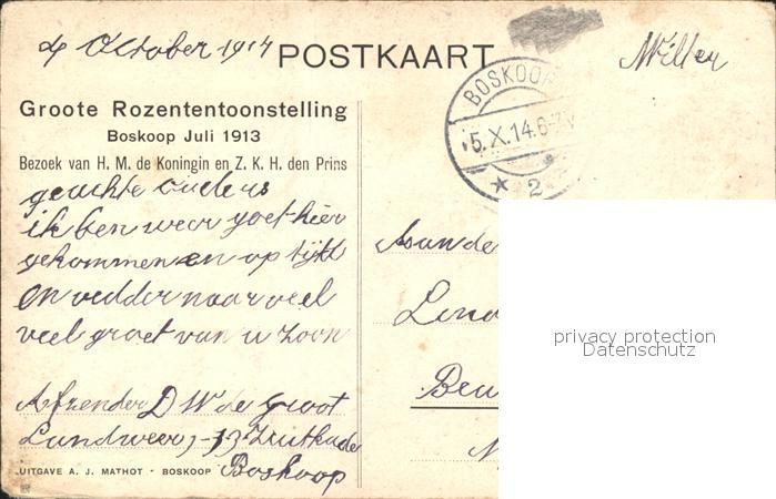 alte Postkarte Adel Niederlande Koenigin Wilhelima Prinz Hendrik Groote Rozententoonstelling Boskoop Juli 1913 postalisch gelaufen Erhaltung siehe scans