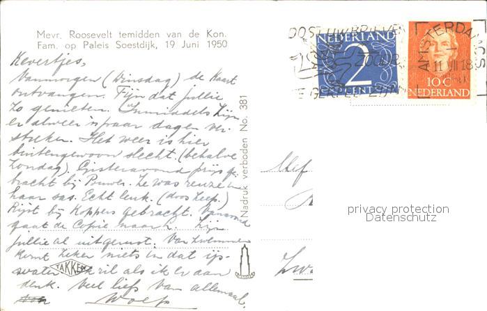 alte Postkarte Adel Niederlande Koenigliche Familie Roosevelt Paleis Soestdijk postalisch gelaufen Erhaltung siehe scans