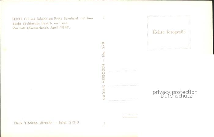 Adel Niederlande Prinzessin Juliana Prinz Bernhard Beatrix Irene Zermatt postalisch nicht gelaufen